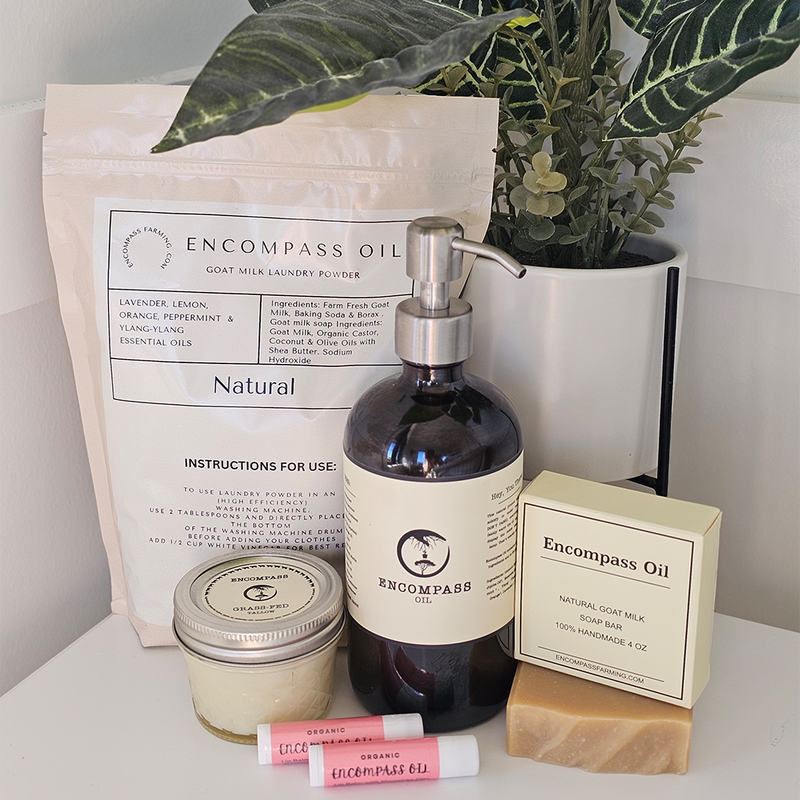 1x Encompass Oil 16oz Glass with Pump 1x 4oz Tallow 2x Bars of Encompass Goat Soap 1x Encompass Laundry Soap...